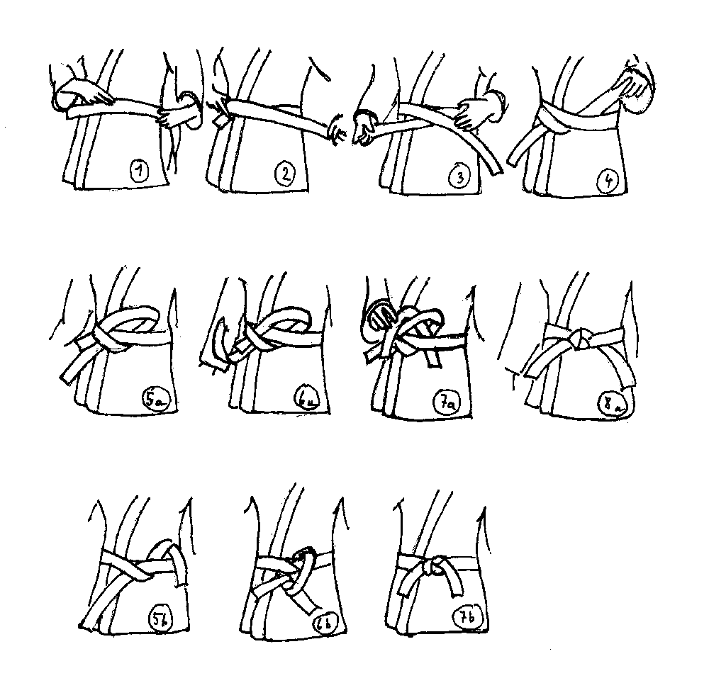 Im Wesentlichen benutzen wir zwei Varianten, den Gürtel zu binden. Für beide Varianten beginnt man mit den Schritten 1-4, Variante a ist etwas komplizierter, erzeugt aber einen Knoten, der besser hält.