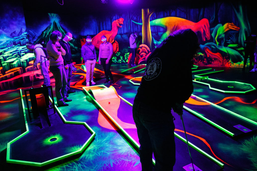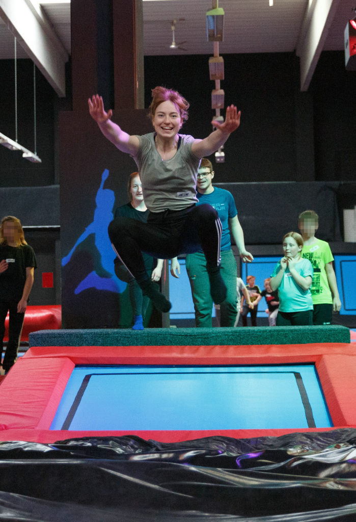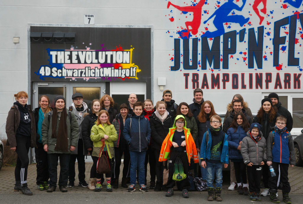Diesmal stand kein Ju Jutsu, Jiu Jitsu, BJJ oder Taekwondo auf dem Programm, sondern zwei Sportarten mit einem etwas anderen Bewegungsablauf. Neunzehn unserer Sportler tobten sich auf einer Trampolinfläche von 2000m2 ordentlich aus, zeigten ihre Stärken beim Ninja-Parkour oder überwanden ihre Angst gegen die Höhe, während fünf unserer tapfersten Kämpfer den Nachmittag neben Dinosauriern, Raumschiffen und Vulkanen bei einer Runde Schwarzlicht-Minigolf verbrachten.